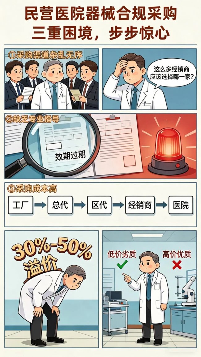 除此之外,居高不下的采购成本也让民营医院不堪重负。传统医疗器械多级分销模式下,一台设备从出厂到医院历经层层加价,30%—50% 的渠道溢价最终全部由医院承担。医院迫于价格压力,不得不向产品质量妥协。