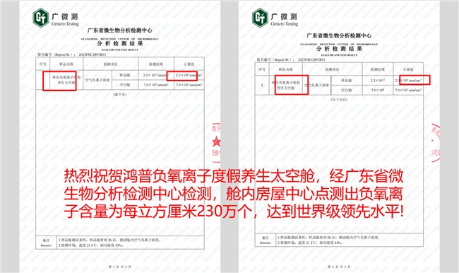 (图:鸿普负氧离子度假养生太空舱经官方实测负氧离子含量为230万个/立方厘米的检测报告)