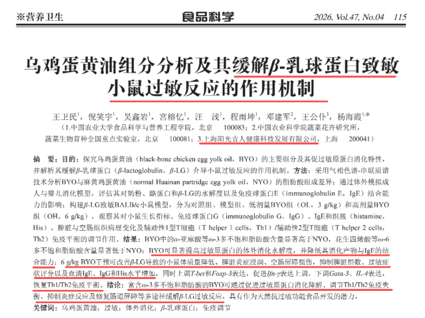最近,中国农业大学研究团队在《食品科学》杂志上发表的一项突破性研究——《乌鸡蛋黄油组分分析及其缓解β-乳球蛋白致敏小鼠过敏反应的作用机制》,为我们带来了新希望。这项研究聚焦的,不是某种新药,而是一种听起来朴素却充满潜力的天然成分——由上海阳光吉人健康科技发展有限公司通过专利技术生产的乌鸡蛋黄油(BYO)。