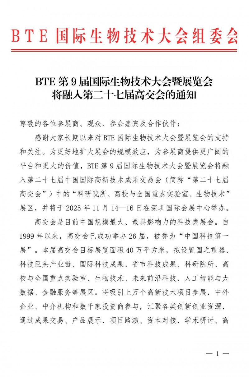 BTE第9届国际生物技术大会暨展览会将融入第二十七届高交会的通知