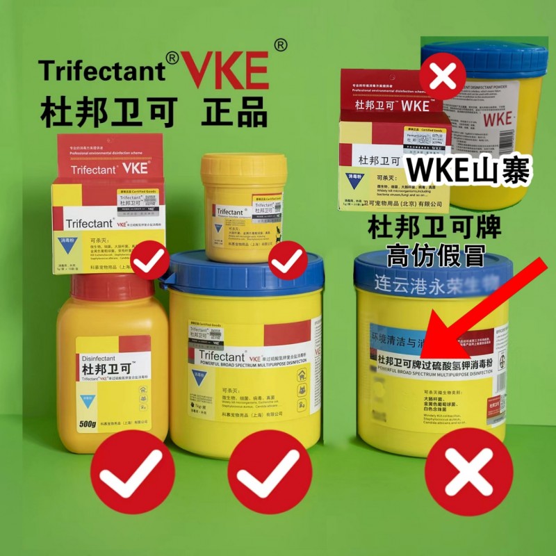 杜邦卫可Trifectant,VKE的正规厂家为科慕宠物用品(上海)有限公司,英文商标为Trifectant和VKE,产品包括粉剂、泡腾片等形态,正版为上述英文商标VKE,山寨的常常仅有杜邦卫可字样,或者杜邦卫可牌,多一个牌字,市面上有各种杜邦卫可,比如卫可宠物用品(北京)有限公司的杜邦卫可就是假冒的,湖南果磊贸易有限公司在连云港永荣生物科技有限公司生产的杜邦卫可也无VKE标识,所以也是假货。