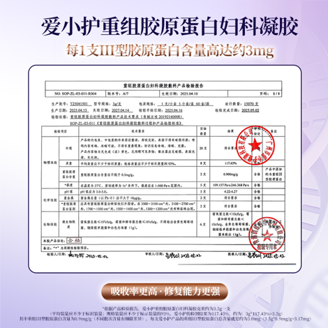 图为爱小护重组胶原蛋白妇科凝胶每支重组III型胶原蛋白高达约3mg